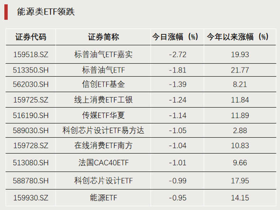与此同时,能源类ETF出现一定回调。2只标普油气ETF跌幅居全市场前两位,而这两只基金昨日均涨超9%。此外,部分主投传媒板块的ETF跌幅也较为靠前。