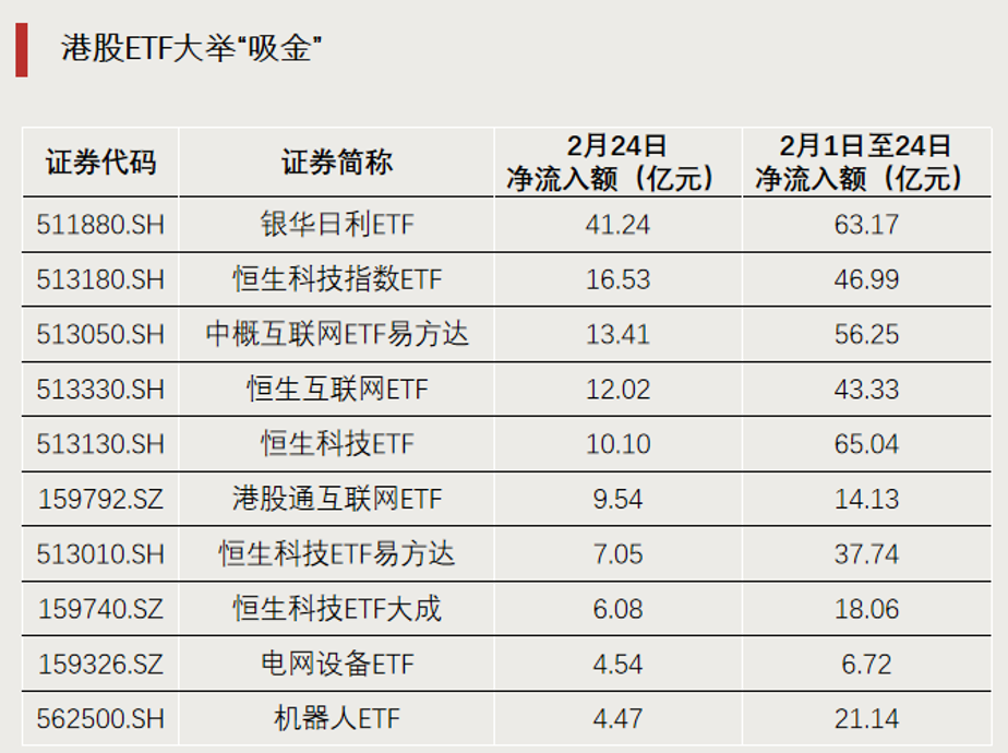前一交易日(2月24日),ETF全市场单日获资金净流入额超过110亿元。这也是近6个交易日以来,单日资金净流入额最高的一天。主投港股市场的ETF吸金势头较强。单日资金净流入额前十的ETF中,港股ETF占比过半。